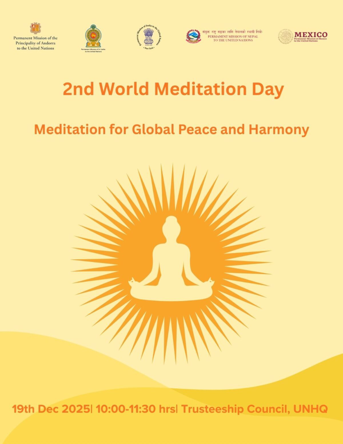 The Permanent Missions of Andorra, India, Mexico, Nepal and Sri Lanka are pleased to invite you to the second commemoration event of the World Meditation Day at the UN on the theme “Meditation for Global Peace and Harmony.”
